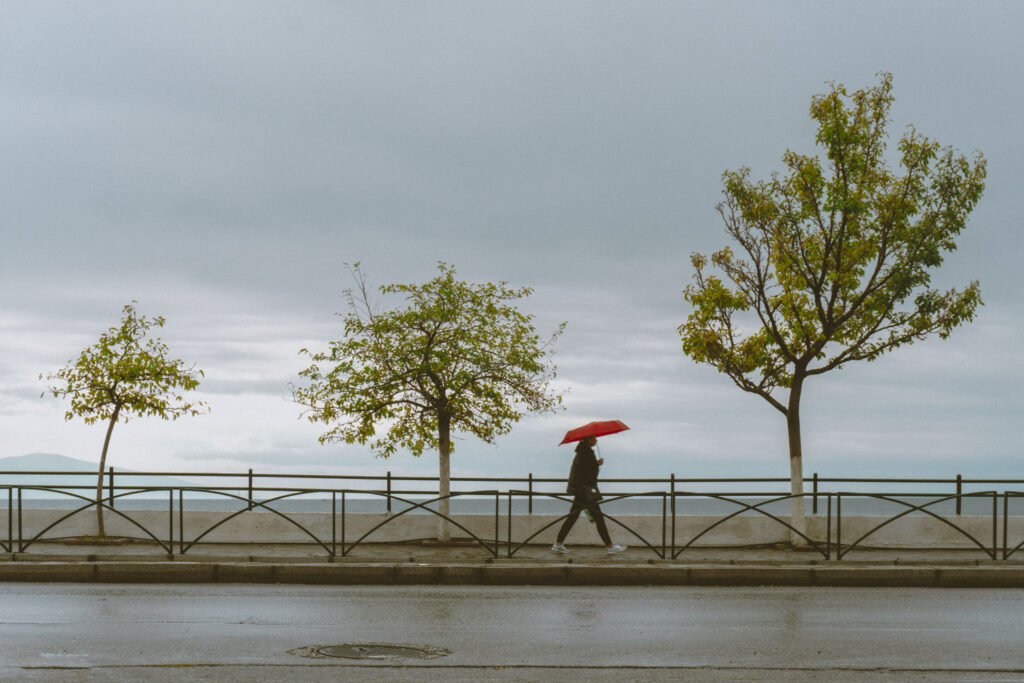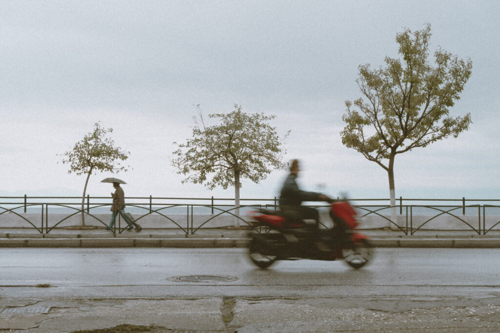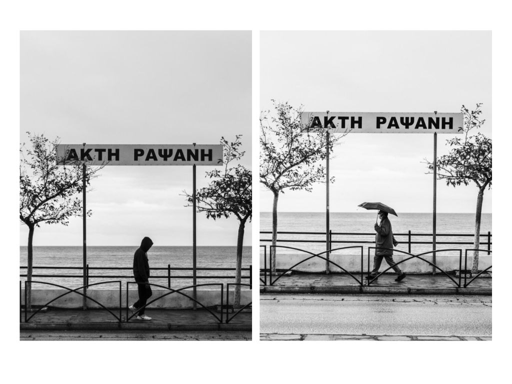 Η φιγούρα με την κουκούλα που περνά σκυφτή κάτω από την πινακίδα, ο μεγαλύτερος άντρας με τον χαρακτηριστικό αργό βηματισμό, η γυναίκα με την κόκκινη ομπρέλα που έγινε η μοναδική ζεστή πινελιά μέσα σε ένα ψυχρό κάδρο — όλα αυτά είναι εικόνες που γεννήθηκαν λόγω της βροχής.